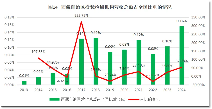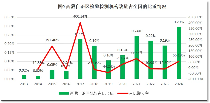 截至2024年末,西藏自治区检验检测机构数量为156家,约占全国检验检测机构数量的0.29%,由于西藏特殊的经济环境,其检验检测行业规模的排名一直为全国倒数第一。过去12年,西藏自治区检验检测机构数量在全国检验检测行业中的占比以及占比的增长率如图10所示。