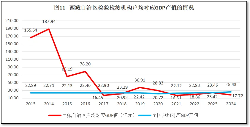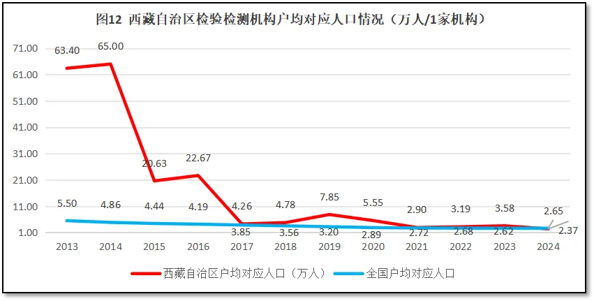 2024年末,西藏自治区常住人口370万人,检验检测机构户均服务人口2.37万人,比全国平均数2.65万人略低,排名全国第18位,较2023年度排名下降了16位(2023年度排名全国第2位,属于人口多机构少的状况)。可见,2024年机构数量的剧增,相对于西藏自治区人口数量来说已经显得检验检测机构数量过剩。由图12可见,在2017年之后,西藏自治区检验检测机构户均对应的人口数量变化曲线回落到相对合理的区间,规律总的来说与全国的情况类似,都是逐年下降的趋势,但西藏的数据线起伏大一些,且一直高于全国的数据,直到2024年才略低于全国平均数。