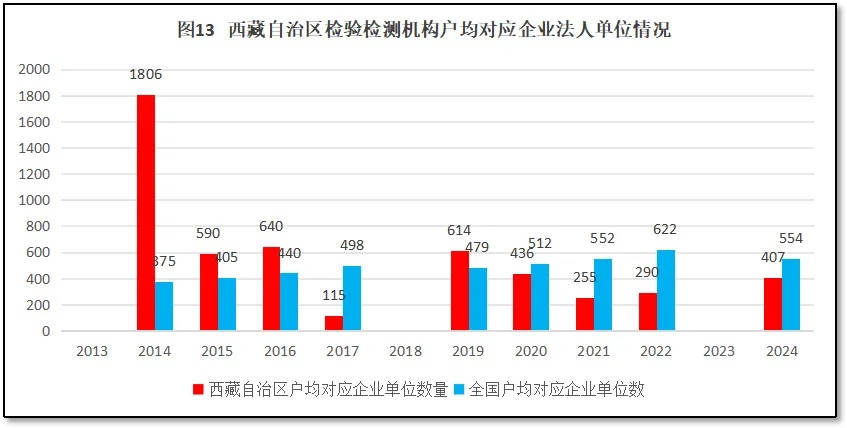 再来看检验检测机构户均对应的企业法人单位数量情况。过去12年西藏自治区地区检验检测机构户均对应企业法人单位数量与全国情况的比较如图13所示。