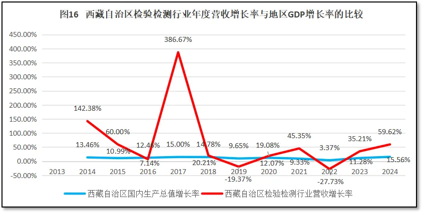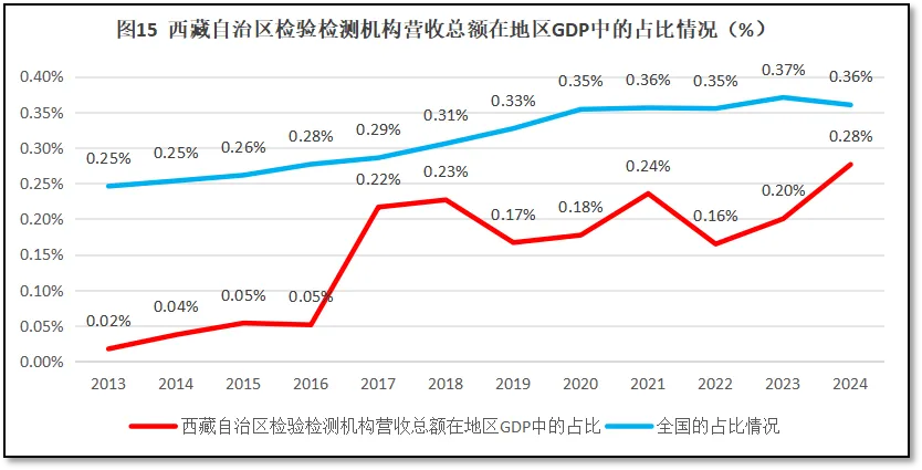 从图15可见,西藏自治区检验检测机构营收总额在当地GDP中的占比一度有较快增长,在2017年达到0.22%后基本上停止增长,在这一水平上逐年波动。2024年出现了较为明显的增长,从2023年的0.2%增长到0.28%。从这些数据看,西藏自治区检验检测行业的发展对于西藏自治区的经济有一定贡献,贡献率变动起伏较大,2024年这一贡献度有较明显增长。