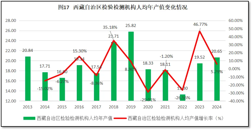 由图17可见,过去12年,西藏自治区检验检测机构人均年产值的变化并非从小增大的变化,而是一直在20万元左右波动,在2019年一度达到25.82万元的峰值,也曾在2022年跌落13.3万元的低谷。2024年西藏自治区检验检测机构人均年产值回升到20.65万元,距离30万元行业温饱线和2024年度全国31.45万元平均数还有不少距离,排名居于全国第24位,较2023年度排名下降2位。12年来,西藏自治区检验检测机构人均年产值增长率隔年变动幅度很大,总体来看增长很微小,年均增幅为2.32%。这表明西藏自治区地区检验检测机构经营状况一般,劳动生产率不高,机构盈利能力不强,基础太低,起伏又大,还没有成为一个成熟的可预测的行业群体。