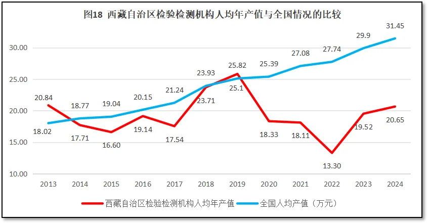 西藏自治区检验检测机构人均年产值与全国的情况比较如图18所示。