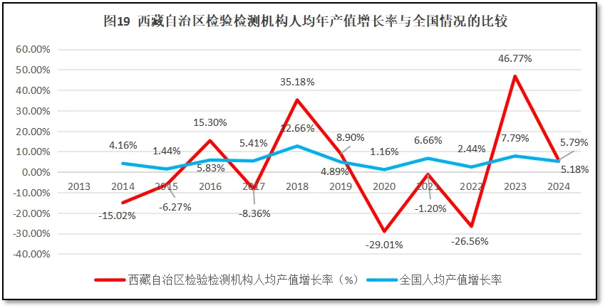 再来看西藏自治区检验检测机构人均年产值增长率与全国人均年产值增长率的比较,如图19所示。