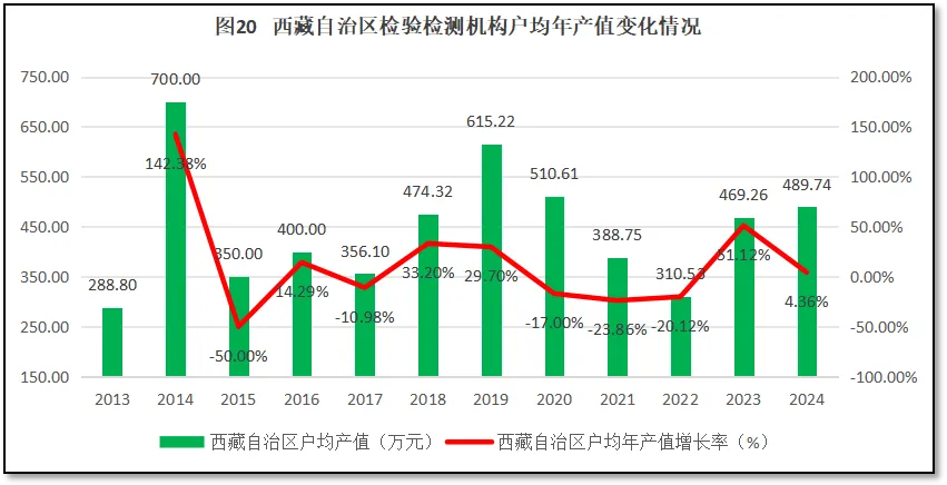 由图18可见,西藏自治区检验检测机构人均年产值增长十分缓慢,一度在2018-2019年达到甚至超过了全国平均数,但近年来一直在低位徘徊,与全国平均数的差距有所拉开。2024年西藏自治区检验检测机构人均年产值比全国平均数低了10.8万元。这表明,尽管西藏自治区检验检测行业还在发展,但由于起点较低、速度又慢且不稳定,再加上区域经济欠发达,在各省竞争中还是居于靠后的位置。