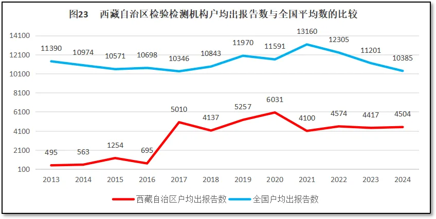 由图23可见,过去12年,西藏自治区检验检测机构户均出报告数量总的趋势是缓慢增长,在个别年份有较大增幅,但往往次年就会回落,从2013年的495份逐步增长到2024年的4504份,且一直低于全国平均线,2024年度比全国平均数低了5881份。从这一数据可见,西藏自治区检验检测行业的业务量总体并不饱满,检验检测市场不大。