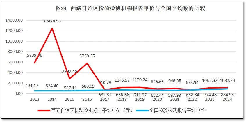 由图24可见,西藏自治区检验检测报告的单价总体从2013年为远高于全国平均数的5839.06元,之后一度增长到1.24万元,之后几年剧烈波动,到2017年之后回落到710.79元后变化规律才逐步温和,但一直高于全国平均数,2024年度的检验检测报告单价为1087.23元,排名全国第10位,较2023年度排名下降2位。从检验检测报告单价来看,西藏自治区检验检测报告单价偏高,且波动激烈,显示出行业和市场的不成熟。