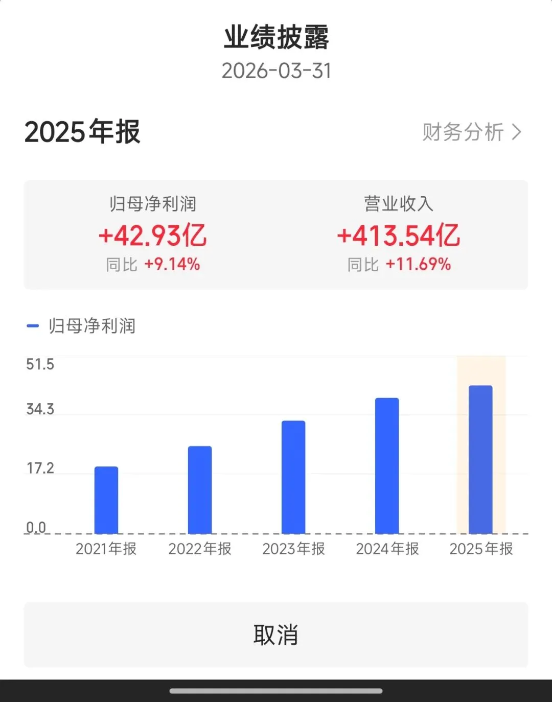 2025年财报数据显示,营收413亿,同比+11%;净利润42亿,同比9.14%;10派12.5元分红