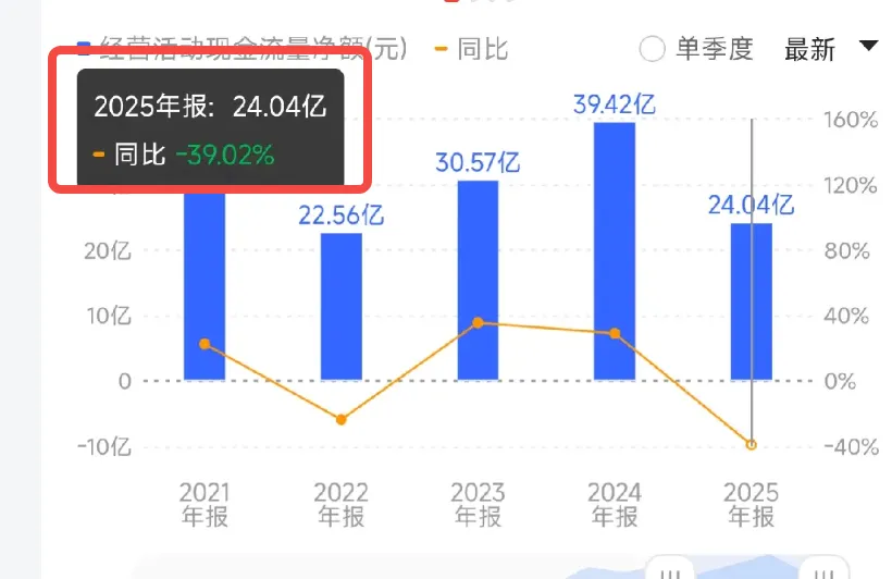3. 现金流恶化:经营活动现金流下跌了39%,从39.4亿下跌到24.04亿。
