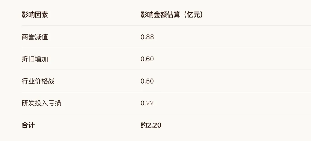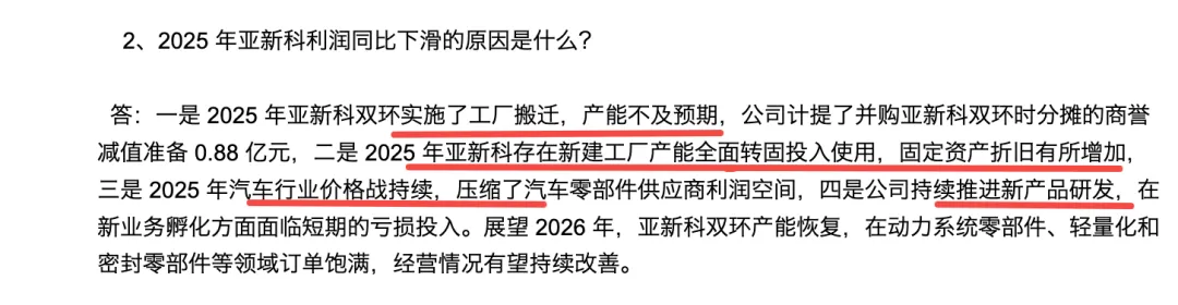 但主要原因是25年新建的工厂产能还没完全利用但固定资产已经开始计算折旧,这就带来的商誉减值和折旧的增加,这两项就减少了1.5亿的利润,再加上汽车行业价格战导致利润损失0.5亿