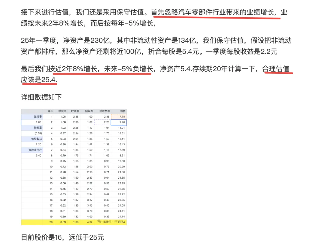 第一是保守估值:忽略汽车行业,盈利按短期2年8%增长,长期每年按-5%,估值结果是25元