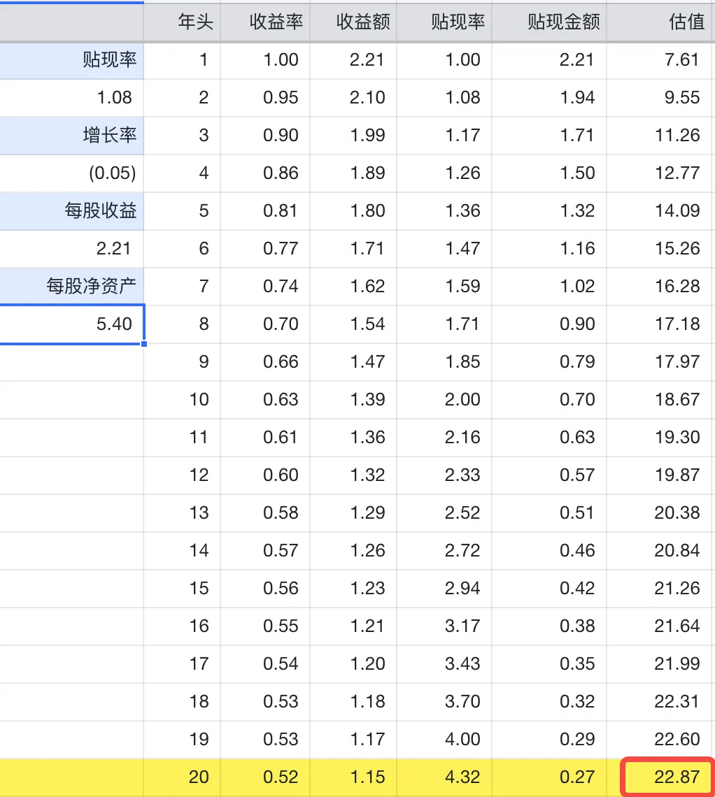 计算的结果是22.87,目前股价是19,不算高估吧。