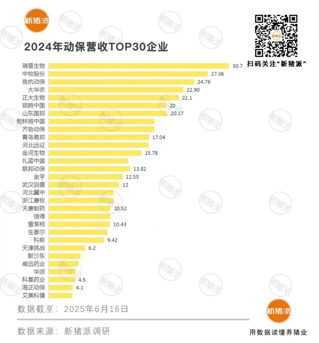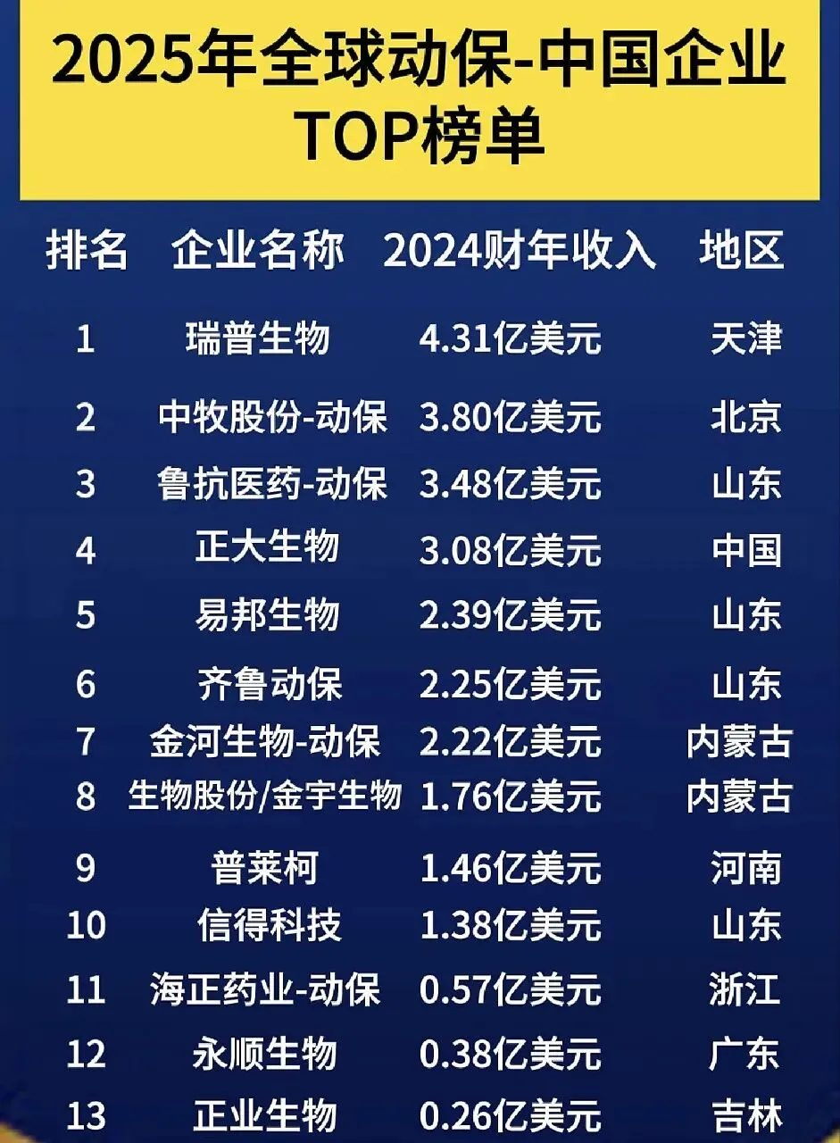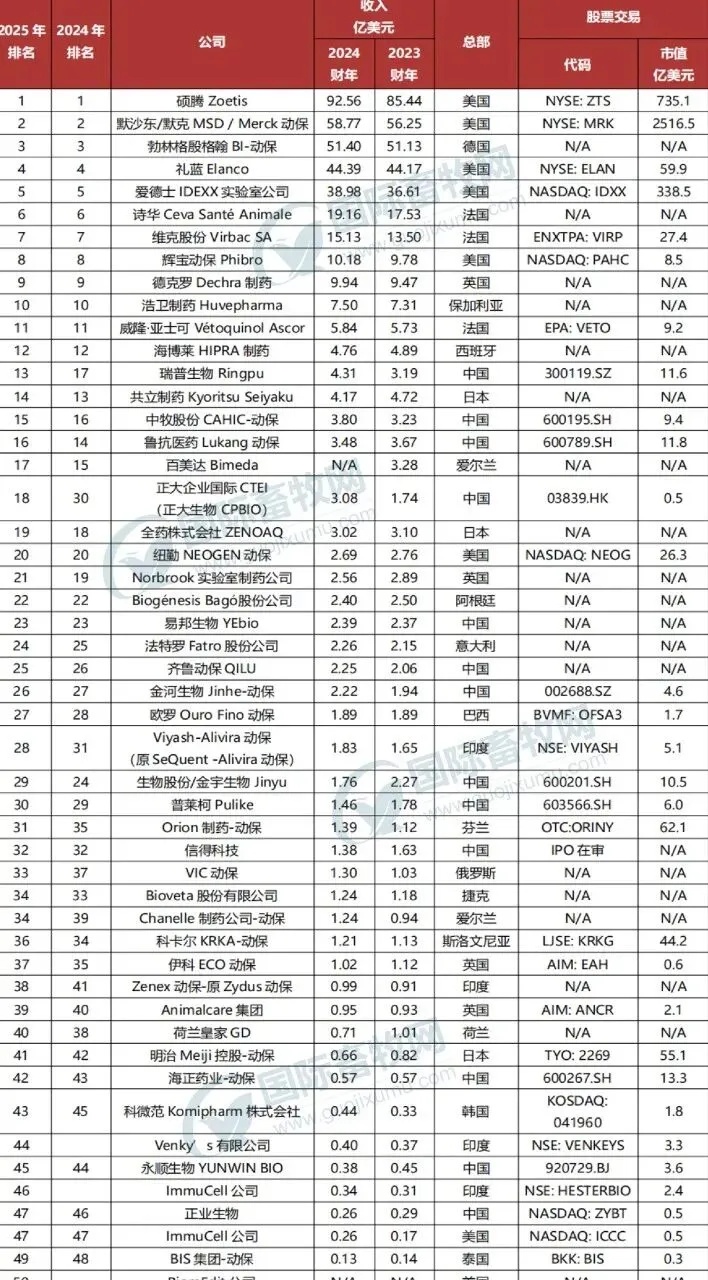 中国企业在全球榜单中占比不足30%,且排名集中在中下游,仅瑞普生物(第13位)、中牧股份(第15位)、鲁抗医药(第16位)进入前20,与国际巨头存在量级差距。