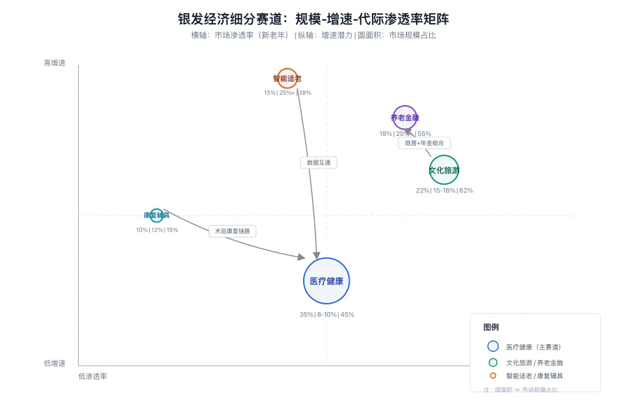 SVG架构图:银发经济五大细分赛道占比与增速矩阵,横轴为市场规模,纵轴为增速,气泡大小代表新老年人渗透率