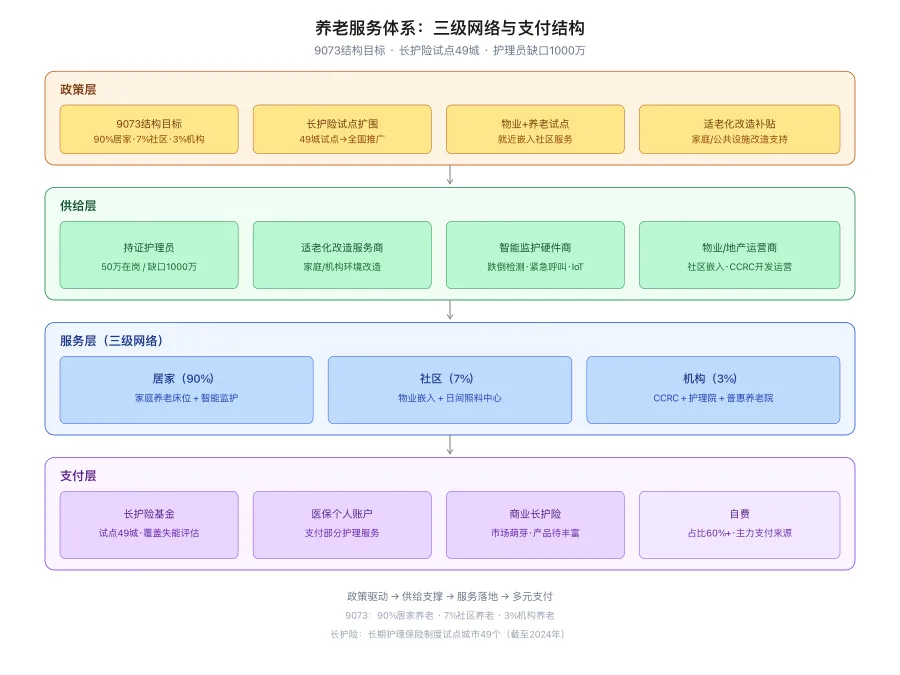中国养老服务体系的政策锚定为「9073」——90%居家、7%社区、3%机构。但现状是机构床位空置率约50%,居家服务供给碎片化,社区嵌入模式尚在试点。这种结构性错配的核心矛盾,不是床位不足,而是「支付端」与「服务供给端」的双向缺失。