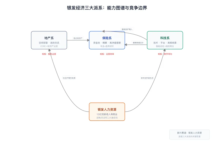 银发经济的参与者可划分为三大派系,各自依托核心能力延伸,形成差异化竞争格局。