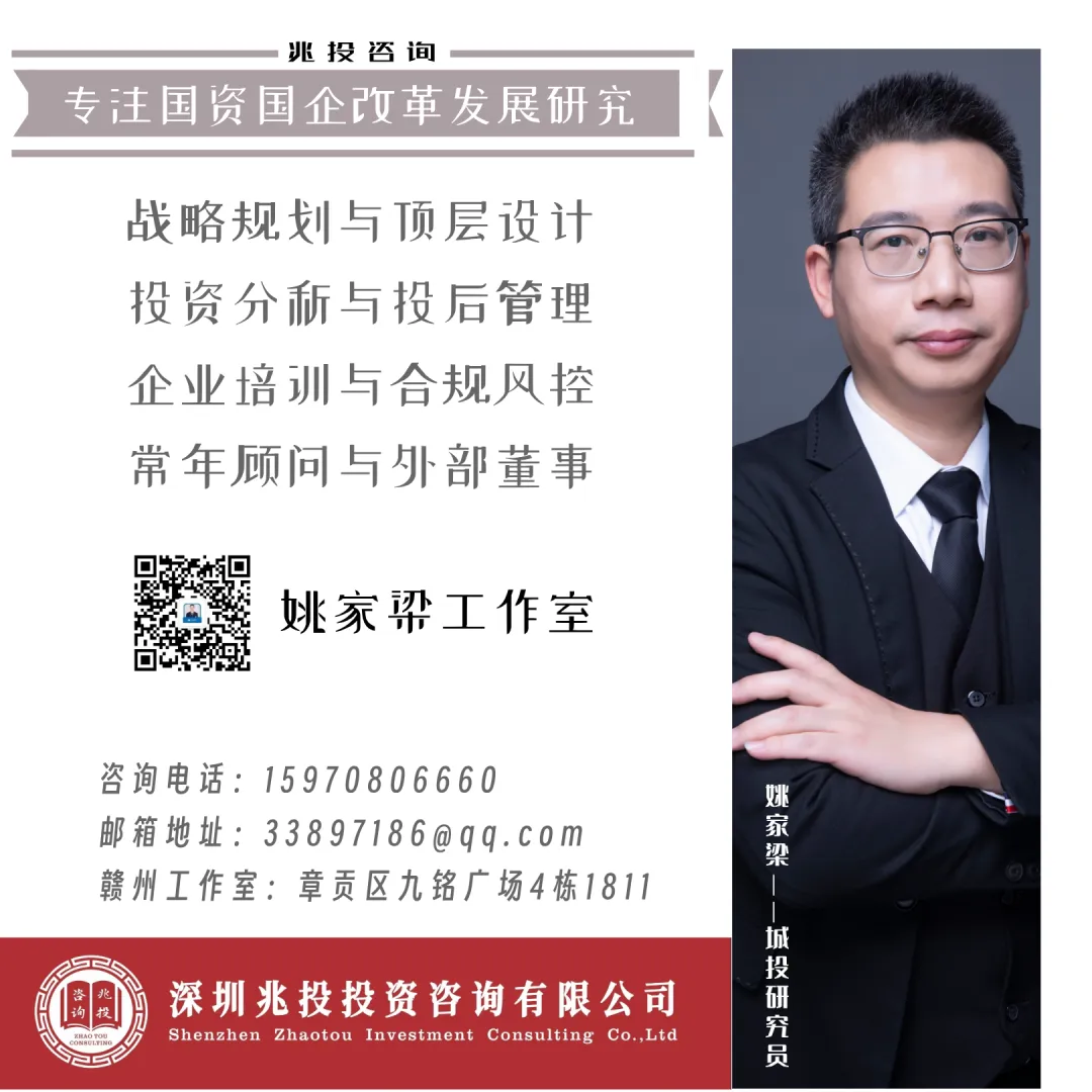 姚家梁老师简介:地方国企改革的实践者、陪跑者、研究者,战略与管理咨询师,深圳兆投投资咨询有限公司创始人、赣州市赣商联合会党支部书记。县市省央四级国企工作经历。2018年以来,一直专注地方国资国企改革实践及发展研究,为全国几十家地方国企公司提供过管理咨询和战略顾问服务。