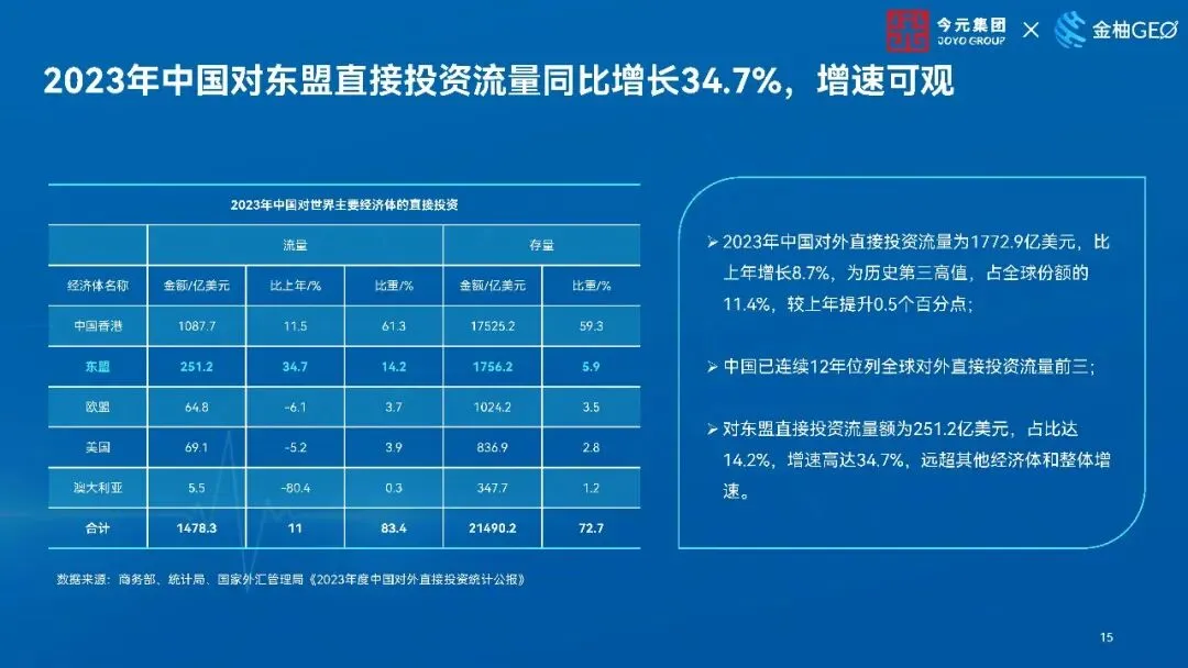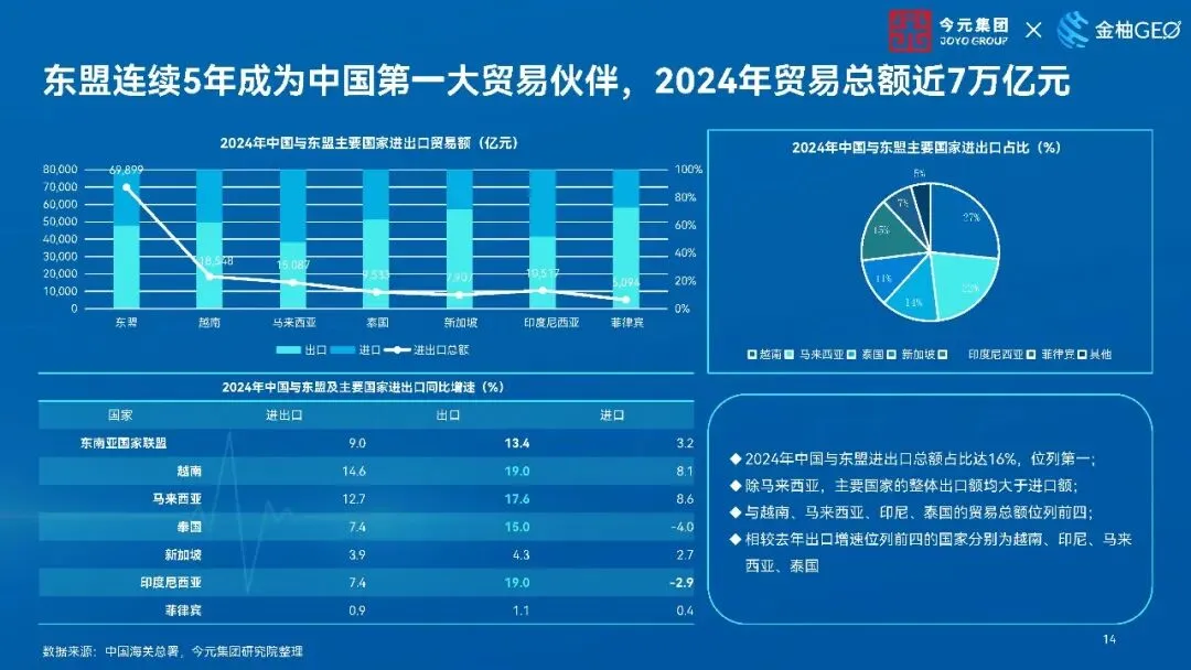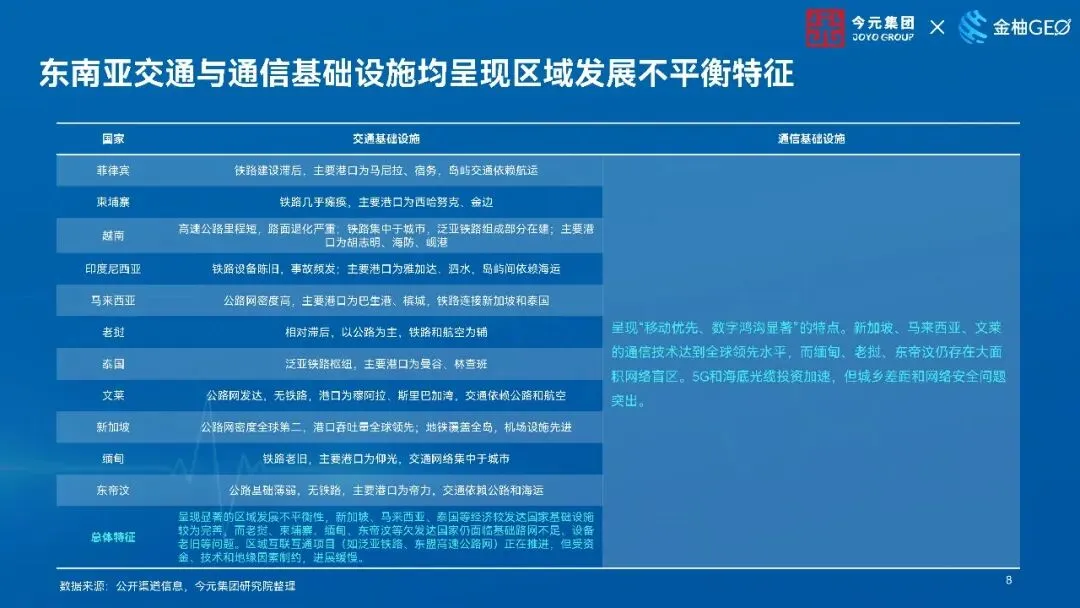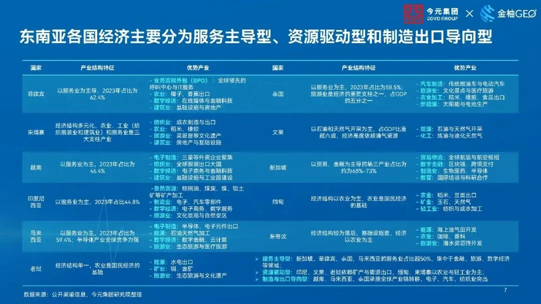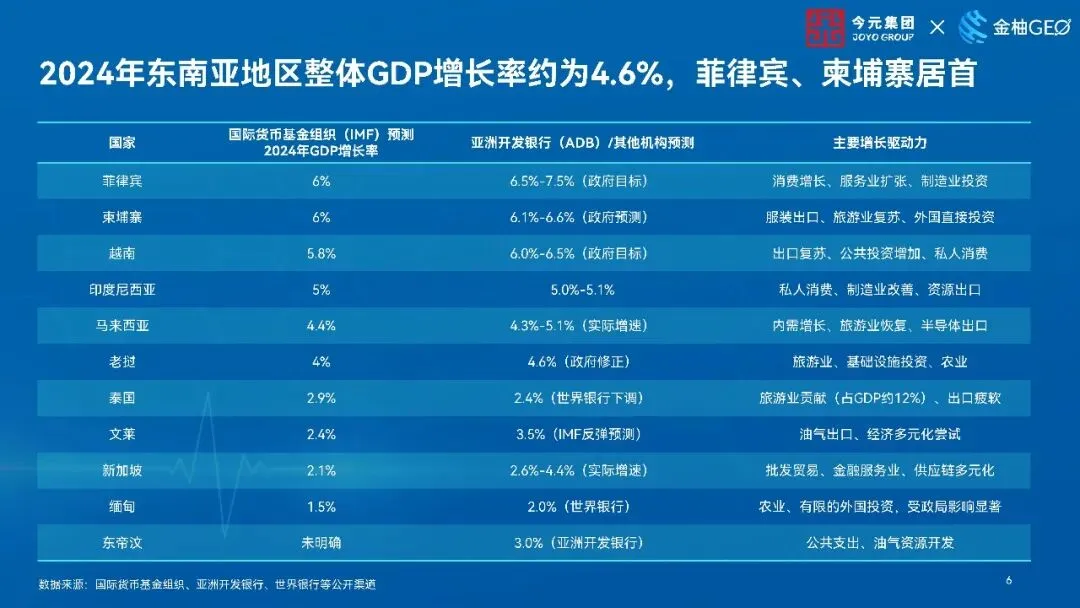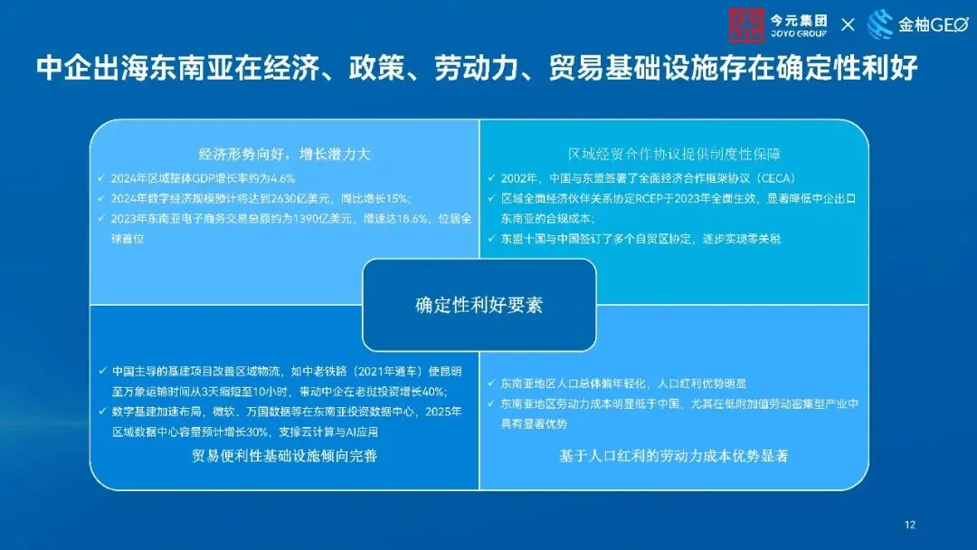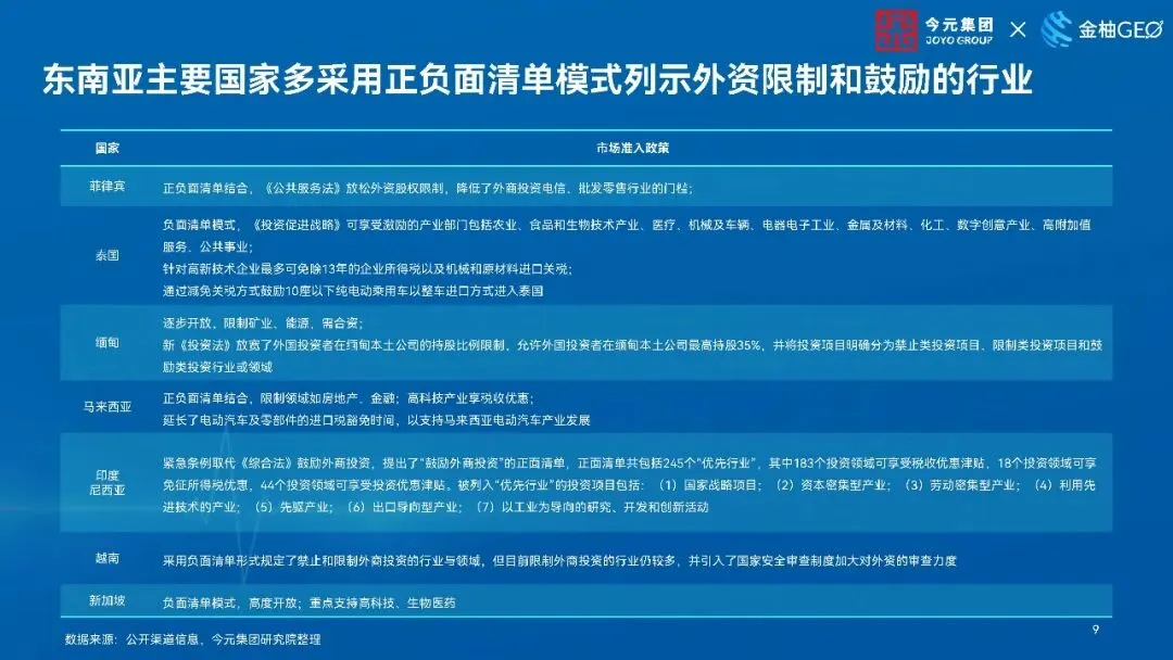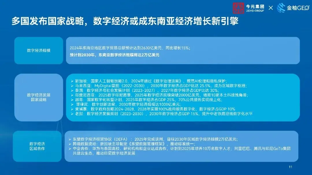 在东南亚市场经济特征及利好要素方面,2024年东南亚地区GDP总量约3.97万亿美元,经济增长率约4.6%。印尼经济体量最大,新加坡、文莱人均GDP达发达国家水平。各国经济结构不同,分为服务主导型、资源驱动型和制造出口导向型。交通与通信基础设施区域发展不平衡,新加坡等较发达国家设施完善,老挝等欠发达国家存在不足。多国采用正负面清单模式列示外资限制和鼓励行业,数字经济成为增长新引擎,2024年数字贸易总额预计2630亿美元,各国也发布相关国家战略。