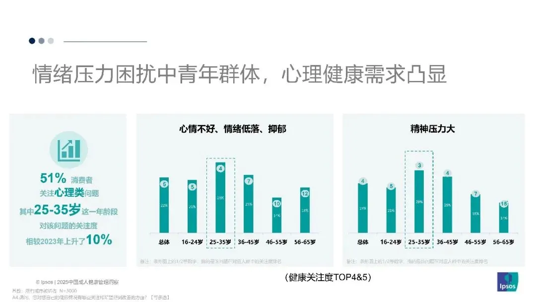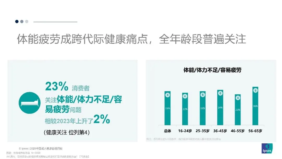在具体健康问题上,肠胃健康、免疫力和睡眠仍是三大核心关注点,分别有38%、36%和30%的受访者提及。值得注意的是,体能疲劳问题正成为跨代际的普遍困扰,总体有23%的消费者表示关注,且各年龄段分布均衡,说明“容易累”已成为都市人群的共性难题。