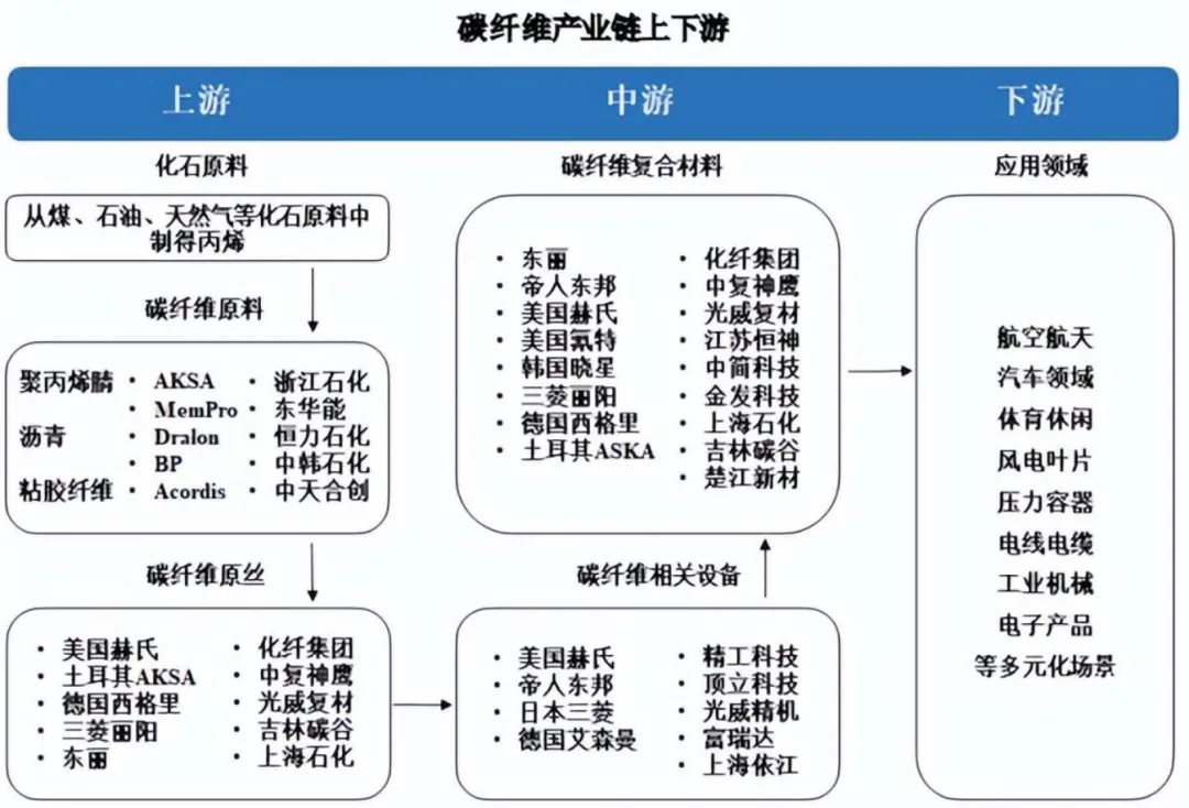 碳纤维预浸料产业链分为上、中、下游三个环节。
