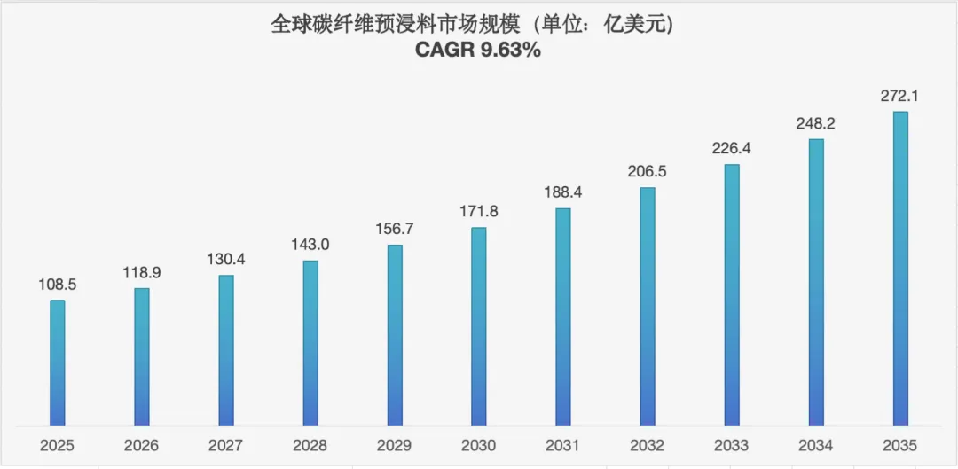 随着航空航天、汽车、可再生能源、电子和工业制造领域对轻质、高强度材料需求的加速增长,全球碳纤维预浸料行业正经历强劲扩张。据Global Growth Insights数据,2025年全球市场规模为108.5亿美元,2026年预计达到118.9亿美元,2027年进一步增至130.4亿美元,预计到2035年将达到272.1亿美元,预测期内复合年增长率高达9.63%。