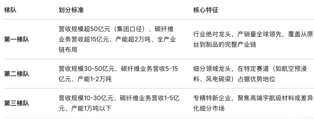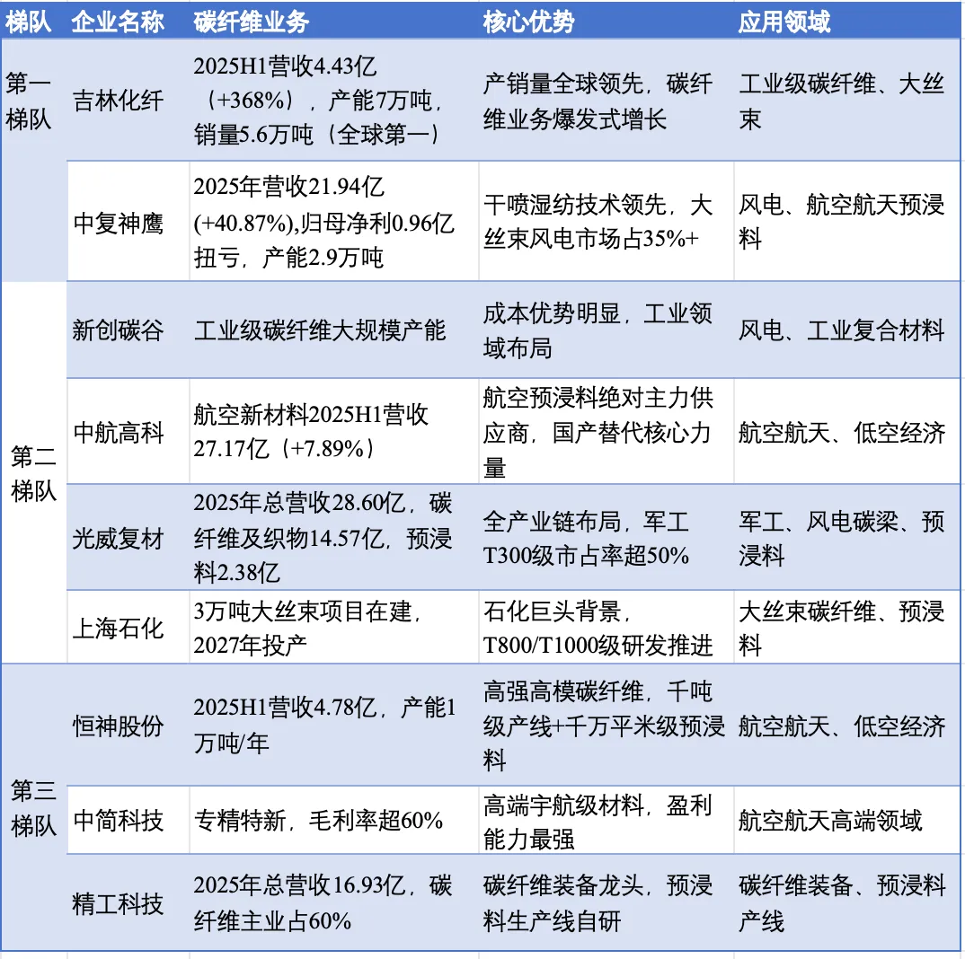 从梯队划分来看,第一梯队包括吉林化纤和中复神鹰;第二梯队包括新创碳谷、新疆隆矩、光威复材、上海石化、宝旌碳材料;第三梯队包括中简科技和长盛科技等企业。