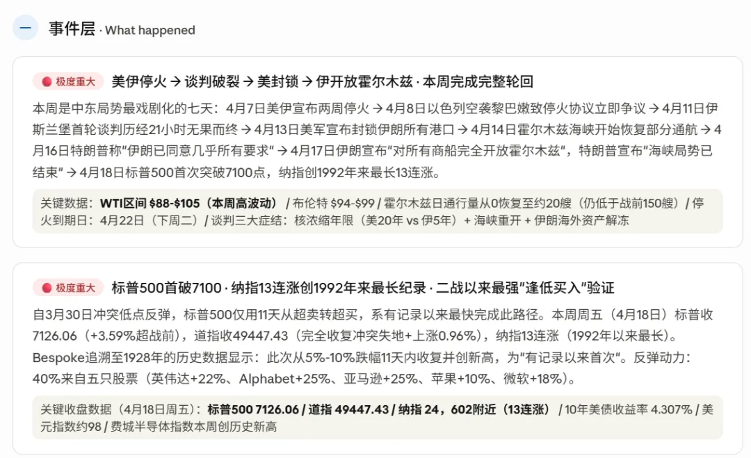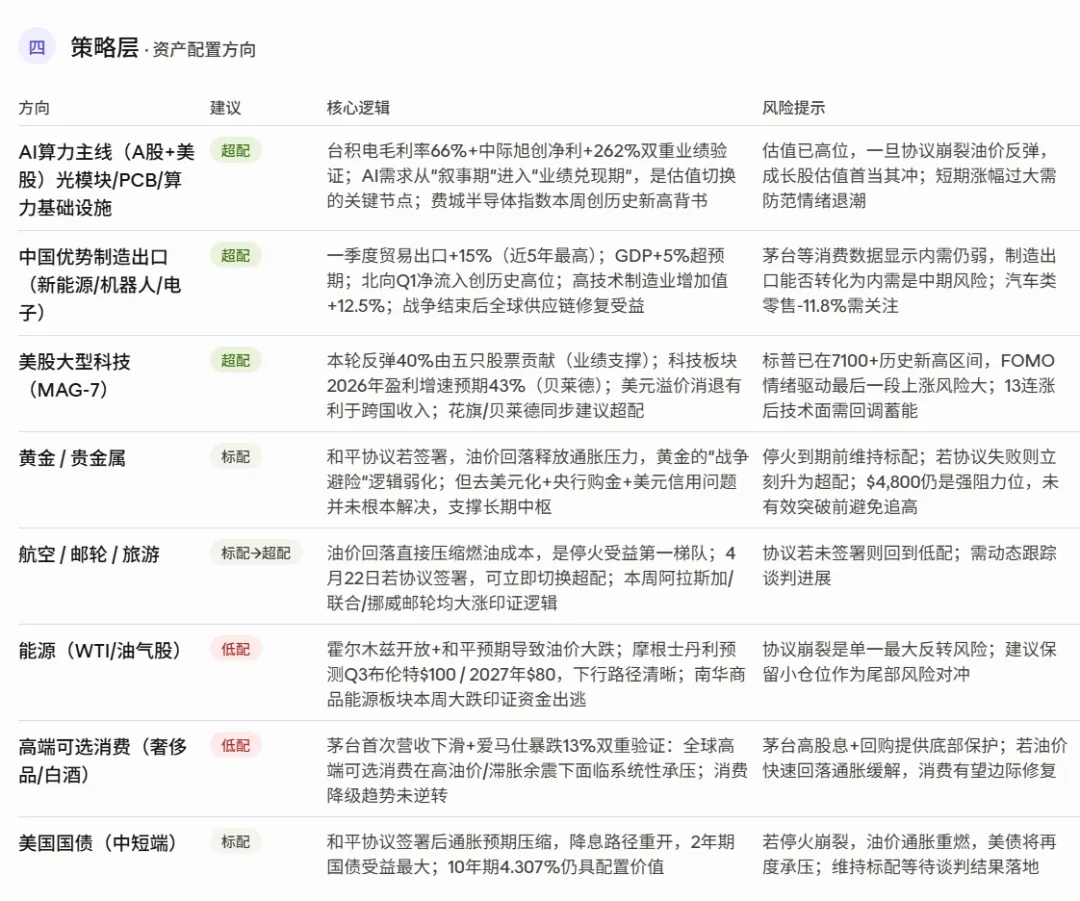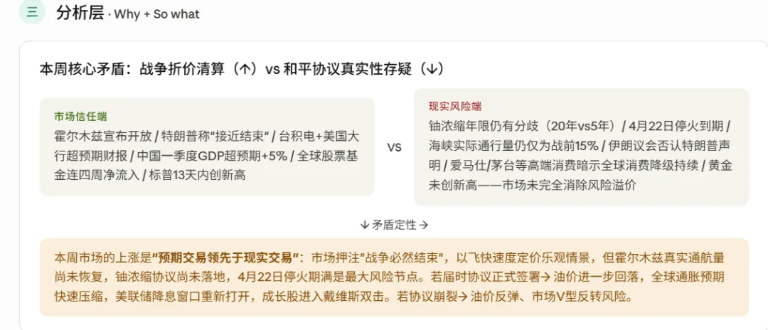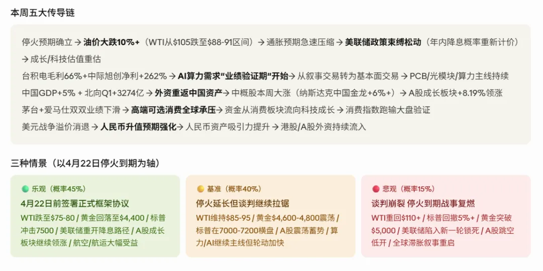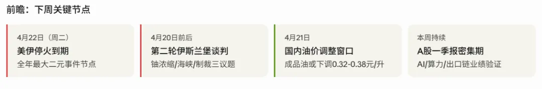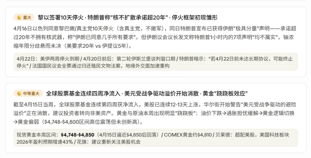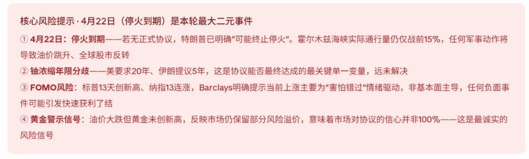 关于黄金作为"诚实市场信号"的解读:本周最值得深思的数据点是——油价大跌超10%(霍尔木兹开放预期),但黄金并未创新高,始终在$4,748-$4,850区间震荡。这个"背离"本身是市场最诚实的表态:乱世黄金的铁律正在被打破——美伊首轮谈判无果,黄金、白银价格不涨反跌,对于一些国家来说,油价高企后买油比买金更重要,当前金价已被严重高估。换言之,黄金未创新高意味着市场对协议的信心并非100%,仍保留了相当的尾部风险溢价。从操作角度,这支持"维持标配黄金、等待4月22日后再判断方向"的策略。