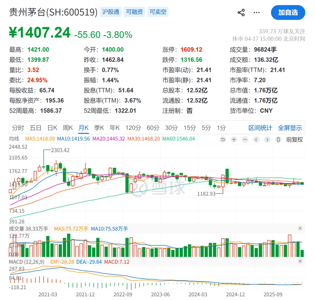 截止到4月17号收盘,贵州茅台市盈率约为21.4倍,股价1407元,自2021年的高点2300元下跌了约900元,跌幅接近40%。考虑到茅台的行业地位和商业模式,我认为茅台即使没有增速,沦为类似长江电力的公共红利股,其合理的估值也在15-20pe之间。