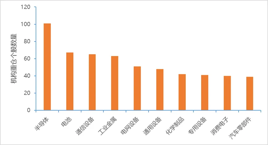 以所有机构持仓的前十大重仓股为统计口径,当前披露的信息显示:半导体、电池和通信设备位列2026Q1机构重仓行业的前3位,半导体行业的机构重仓个股数量破100。