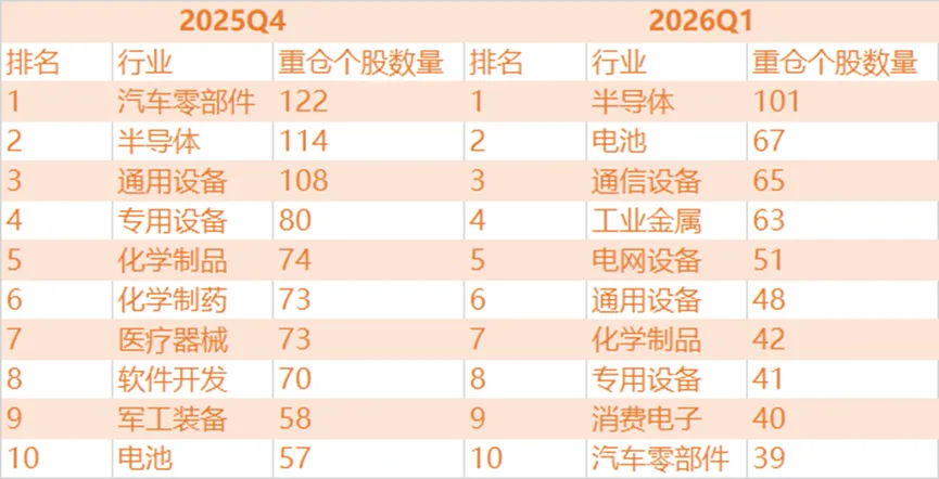 和2025Q4相比,2026Q1机构重仓的前十大行业中,汽车零部件、通用设备、专用设备、化学制品的排名有所下滑,汽车零部件从2025Q4的第1位下滑至2026Q1的第10位。