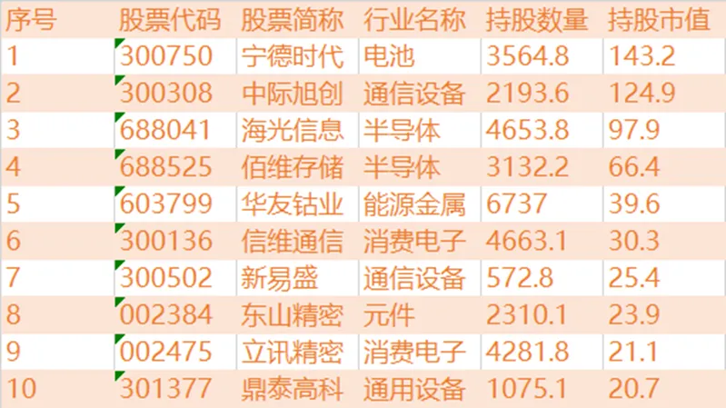 当前的数据显示宁德时代和中际旭创分列机构重仓的前两位,持股市值超100亿,随着后续财报的披露,这一数值还将上升。