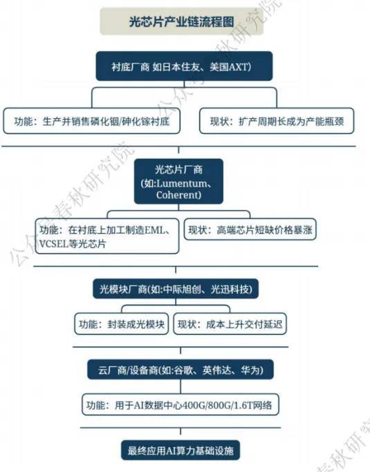全球光芯片产业正面临前所未有的供需失衡局面。受AI算力基础设施爆炸式增长驱动,北美云厂商资本开支持续超预期,高端光芯片(特别是EML激光器)供需缺口持续扩大。根据最新信息,全球光芯片龙头Lumentum宣布其2028年产能即将全部售罄,供需缺口达25-30%,行业景气周期预计至少持续5年。