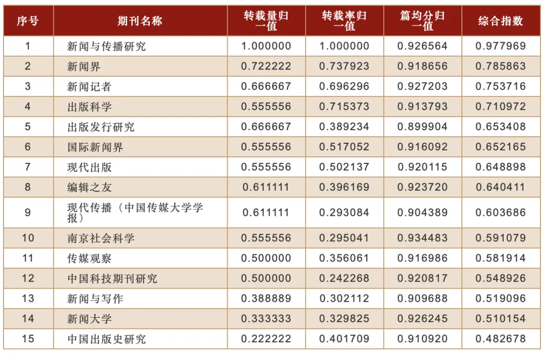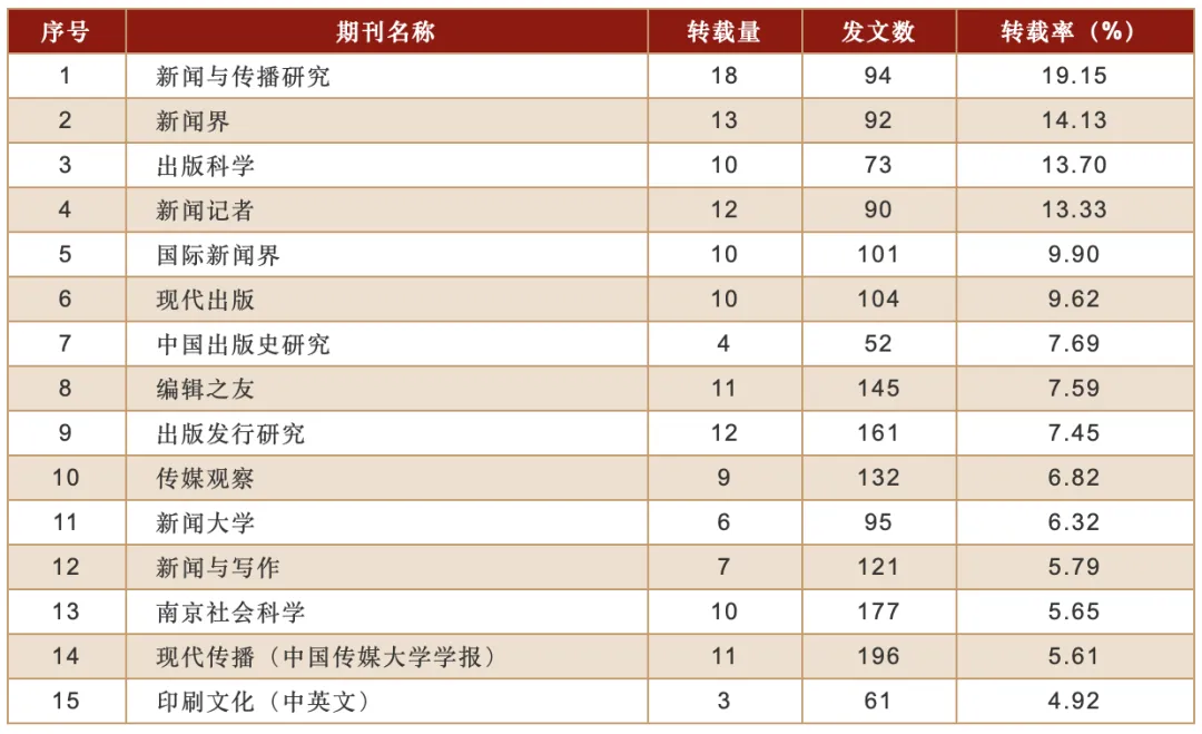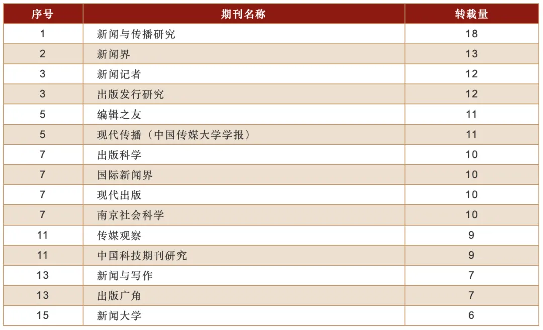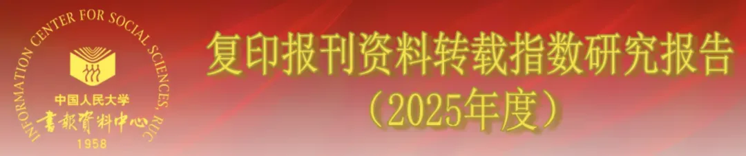 2025年度,本学科被复印报刊资料学术刊全文转载的期刊有84种,转载全文总量为256篇,约占全年复印报刊资料学术刊全文转载总量(11136篇)的2.3%。其中,进入转载量表的期刊有15种,共被转载155篇,约占本学科全年转载总量的60.5%,平均转载量为10.3篇。