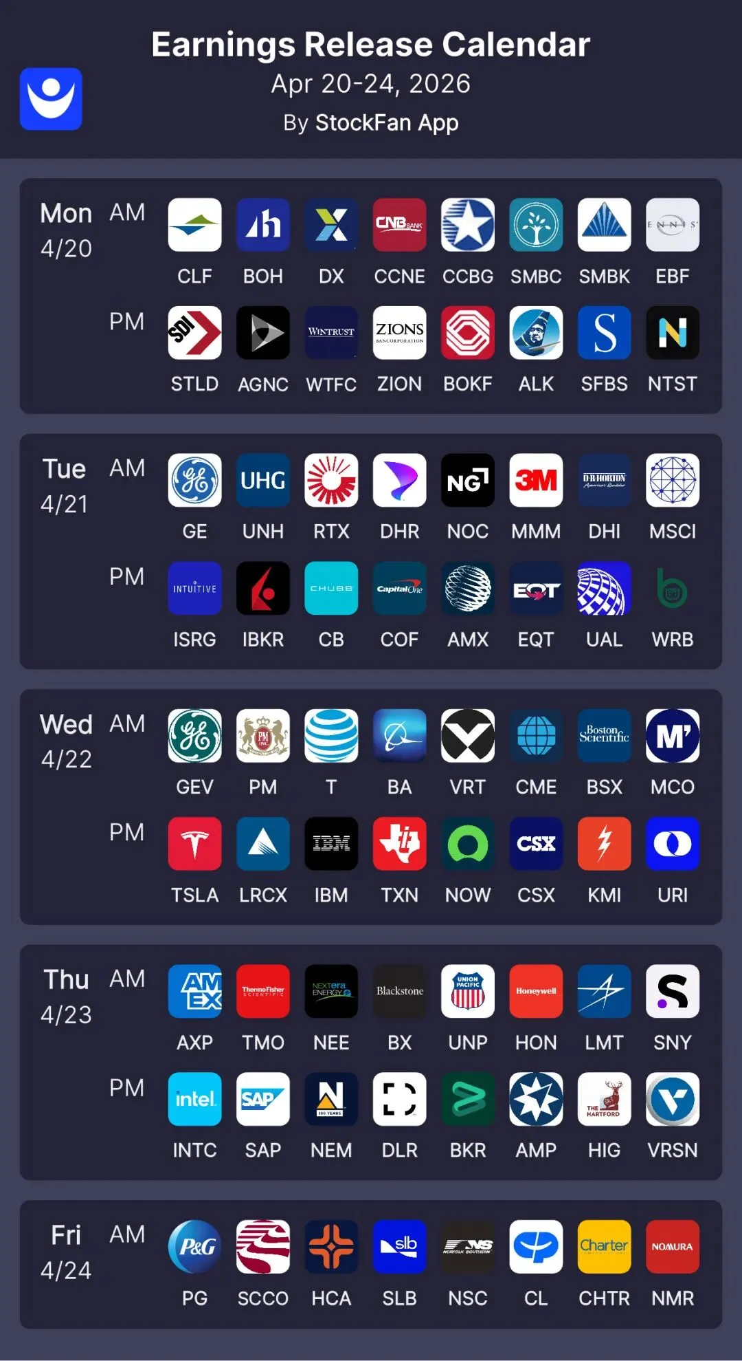 本周4.20-24日美股重磅财报日历: