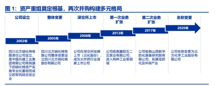 依托集团资产重组,夯实硝化棉行业发展根基,资产收购进一步拓展业务结构。北化股份前身为四川北方硝化棉有限责任公司,成立于2002年,系兵器工业旗下全资子公司泸州北方、西安惠安所属与生产硝化棉相关的资产进行专业化重组而设立的企业。公司于2005年以整体变更方式股改,并于2008年在深交所上市。公司于2013年、2017年分别收购襄阳五二五泵业有限公司、山西新华防化装备研究院有限公司,于2020年更名为北方化学工业股份有限公司,形成硝化棉、特种工业泵、活性炭及防护器材三大业务板块。经过二十余年的发展,公司已成为国产硝化棉行业领军企业,自2004年以来硝化棉产销规模连续多年位居全球前列,产品销往亚洲、欧洲、北美等50多个国家地区。