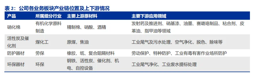 公司当前已形成硝化棉、防护及环保器材及特种工业泵三大主业。公司上市以来,充分发挥资本市场平台作用,持续推进产业结构调整升级,形成以硝化棉为核心的纤维素及其衍生物、以活性炭为基础的防化及环保产品和以渣浆泵为核心的特种工业泵三大主业结构。
