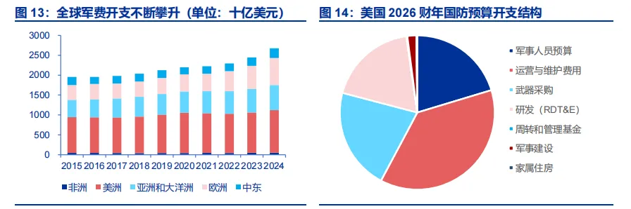 受国际地缘政治及局部冲突影响,军费开支持续扩容。地缘政治波动推动军费开支增加,根据SIPRI(斯德哥尔摩国际和平研究所)数据,2024年全球军费开支总额达到2.68万亿美元,同比增长9.4%,且连续十年持续增长。随着全球军费开支持续攀升支撑武器备库及装备迭代,以美国2026年财年国防预算为例,武器与装备采购费用为2052.24亿美元,相较于2025财年增加18.1%。