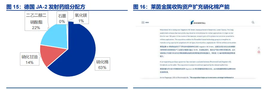 含能硝化棉作为弹药生产的核心原材料,特种需求有望持续增长。根据论文《基于含能热塑性弹性体的高能发射药研究》,高能硝化纤维素是生产单组分和多组分粉末及推进剂的基本原料,对于生产小、中、大口径弹药至关重要,海外相关厂商持续推进产能建设。根据莱茵金属官网,2025年4月,莱茵金属收购民用工业硝化棉生产企业Hagedorn-NC,并计划将生产转换为军用级硝化棉,旨在加强各类弹药特别是155mm炮弹的推进剂制造能力。根据CZ集团官网,同年8月,总部位于捷克的枪械制造商柯尔特CZ集团股份有限公司宣布将分两阶段收购捷克硝化纤维素生产商Synthesia Nitrocellulose,以拓展其大口径枪械及弹药业务。军工巨头加速向上游布局,印证了含能硝化棉在全球弹药供应链中的战略地位日益凸显,需求增长具备长期刚性。