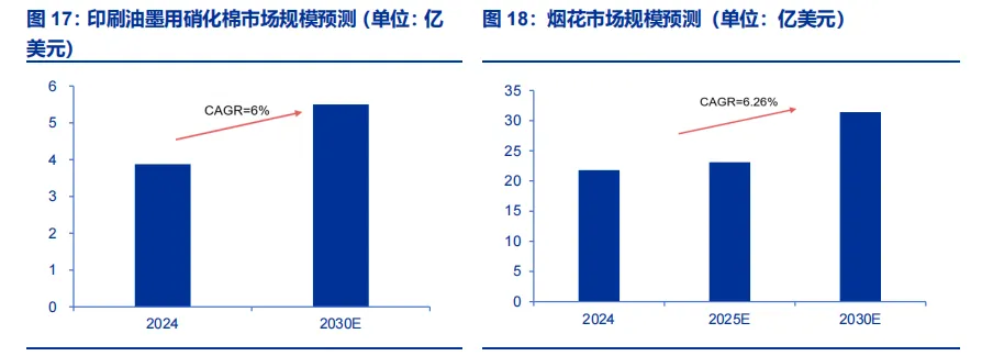 民用硝化棉市场需求基本稳定,新兴应用市场打开。硝化棉是油墨和涂料产品中广泛使用的粘合剂,目前有90%的民用硝化棉产品用于涂料和油墨市场。涂料行业方面,硝基漆相较于水性漆具备速干等优势,下游需求韧性较强。油墨行业方面,近年来高端彩印市场保持增长态势,主要需求为低氮低粘、质量高、流动好的高品质产品,据GII(全球智库)数据,印刷油墨用硝化棉的市场规模预计将在2030年达到5.5亿美元,预测期内年均复合增长率为6.0%。与此同时,环保烟花正成为硝化棉重要的新兴应用领域。硝化棉燃烧时无烟无硫,可作为烟花的核心原材料替代传统黑火药,实现燃放过程的低污染。随着环保烟花对传统产品的替代加速,硝化棉在该领域的应用有望打开全新的成长空间。
