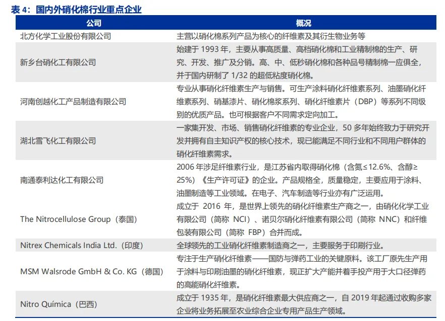 硝化棉行业进入壁垒较高,供给端增量有限,北化股份国内市场份额居前。硝化棉属于特别管控危险化学品,干燥时能自燃,遇高热、火星有燃烧爆炸的危险,因此新增产能准入门槛极高、项目审批极为严格。目前国内硝化棉生产企业数量有限,多数企业生产规模较小、产品质量稳定性不足、产品型号较为单一,主要面向中低端民用市场。国内主要硝化棉生产企业包括北化股份、河南创越、新乡台硝等。其中,北化股份是国内少数具备军工行业特殊资质的企业,产品覆盖军民两大领域,客户黏性较强。根据公司2023年年报,其硝化棉系列产品国内市场占有率超过50%,长期保持行业领先地位。