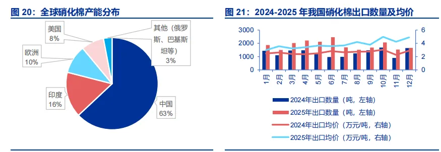 我国硝化棉市场份额居前,2025年出口体量同比高增。根据买化塑研究院数据,2024年我国硝化棉产能占全球总额的63%,为全球第一大硝化棉制造国。根据海关总署数据,2025年我国硝化棉出口量同比增长43.54%,年出口总额同比增长107.50%,其中2025年10月单月出口均价达4.98万元/吨。硝化棉出口体量高增反映全球硝化棉需求旺盛,中国硝化棉企业有望迎来结构性机遇。