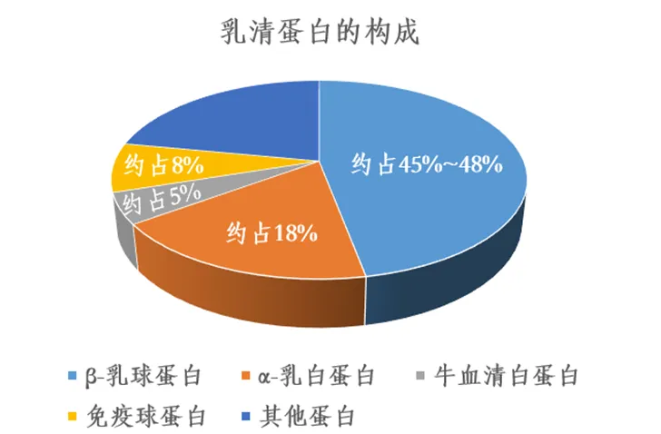 乳清蛋白不是单一蛋白组分,而是多种蛋白组分的集合体,乳清蛋白主要包括 β-乳球蛋白(约占45% ~ 48%)、α-乳白蛋白(约占18%)、牛血清白蛋白(约占 5%)、免疫球蛋白(约占8%)、乳铁蛋白、溶菌酶 、乳过氧化物酶、生长因子等。如图表 1-1所示。