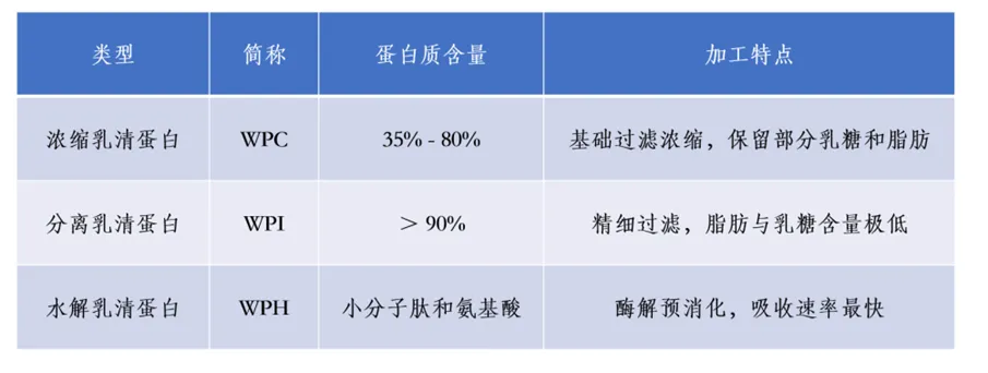 根据加工工艺的深度、蛋白质纯度及功能特性的不同,乳清蛋白产品在行业内有着严格的分类体系。这种分类不仅决定了产品的定价逻辑,也直接对应了下游极其细分的应用场景。乳清蛋白主要分为三类:浓缩乳清蛋白(WPC)、分离乳清蛋白(WPI)、水解乳清蛋白。如图表1-2所示。