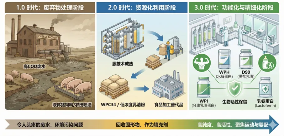 在干酪工业的早期,液态乳清被视为令人头疼的废水。其高化学需氧量(COD)使得直接排放会造成严重环境污染。当时乳清主要被用作廉价的液体猪饲料或直接喷洒在农田中。