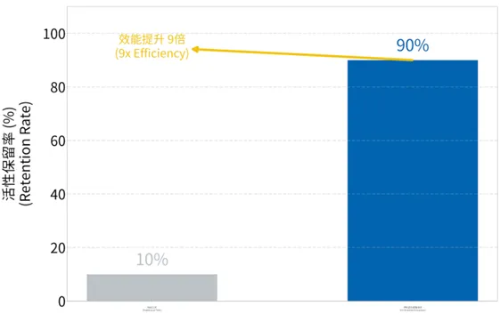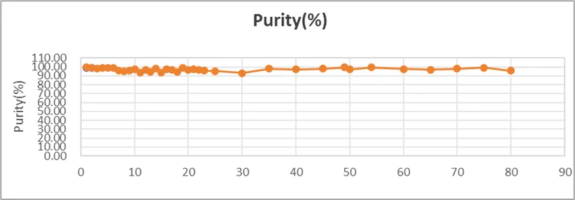 以蓝晓科技(Sunresin)为代表的中国材料厂商,已开发出专门针对乳铁蛋白提取的大孔径、高载量树脂,使得国产乳铁蛋白的制备成本显著降低。蓝晓科技乳铁蛋白专属纯化填料在乳清中分离乳铁蛋白工艺中80cycle周期运行过程,色谱性能稳定,纯度均可以满足95%以上,使用过程80cycle 纯度变化如图1-9所示。