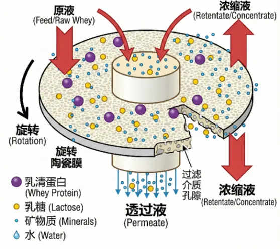 利用孔径在0.1μm-0.2μm的陶瓷膜或螺旋卷式膜,直接对脱脂生鲜乳进行微滤。由于酪蛋白以胶束形式存在(直径约0.15μm),而乳清蛋白以溶解状态存在(直径<0.01μm),微滤过程能将酪蛋白截留在浓缩液中,用于生产胶束酪蛋白MCC或奶酪,而乳清蛋白则穿过膜进入透过液。