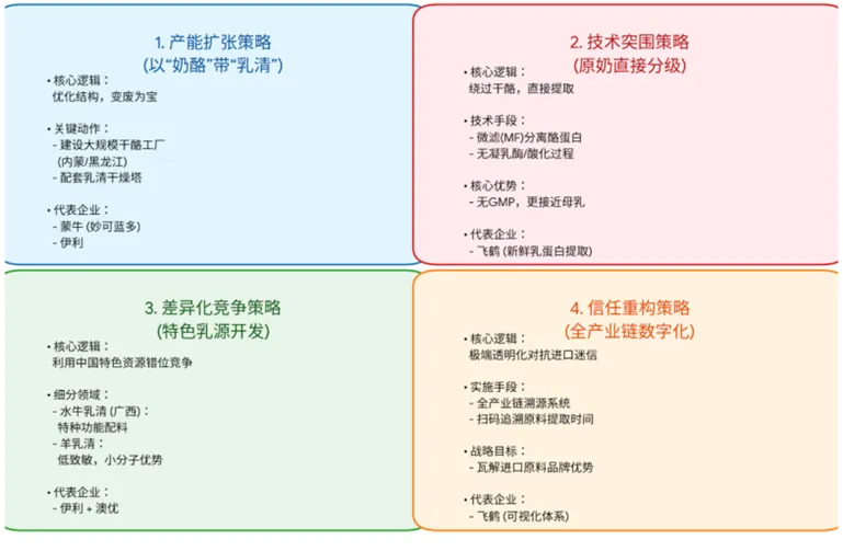 特色乳源的差异化竞争:羊乳清、水牛乳清因其特殊的致敏性低、营养结构独特,在细分市场(如敏感情绪人群、高端烘焙)具有天然的差异化优势,避开了与荷斯坦牛乳清的红海竞争。