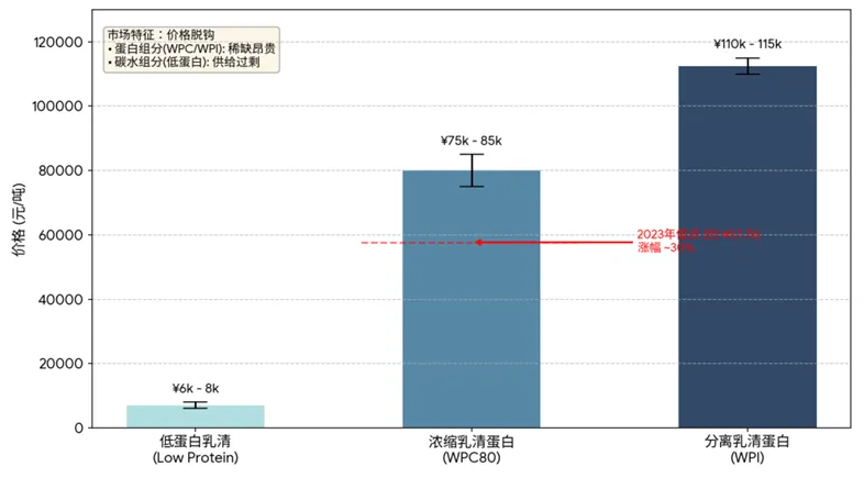 中国受饲料和土地限制,生鲜乳成本高达3-4元/公斤,远高于欧美。乳清蛋白仅占牛奶固形物的0.6%。用昂贵的牛奶去提取微量的乳清蛋白,除非是生产乳铁蛋白(曾高达2万元/公斤),否则在常规WPC80市场,国产产品根本无法与低成本的进口原料竞争,这在经济学上是不可持续的。