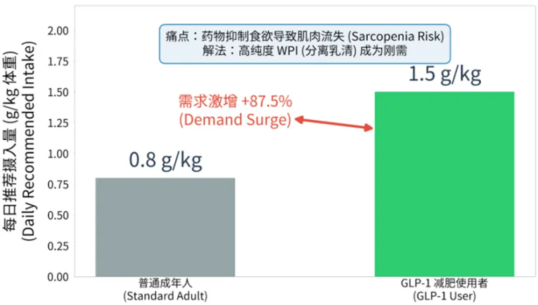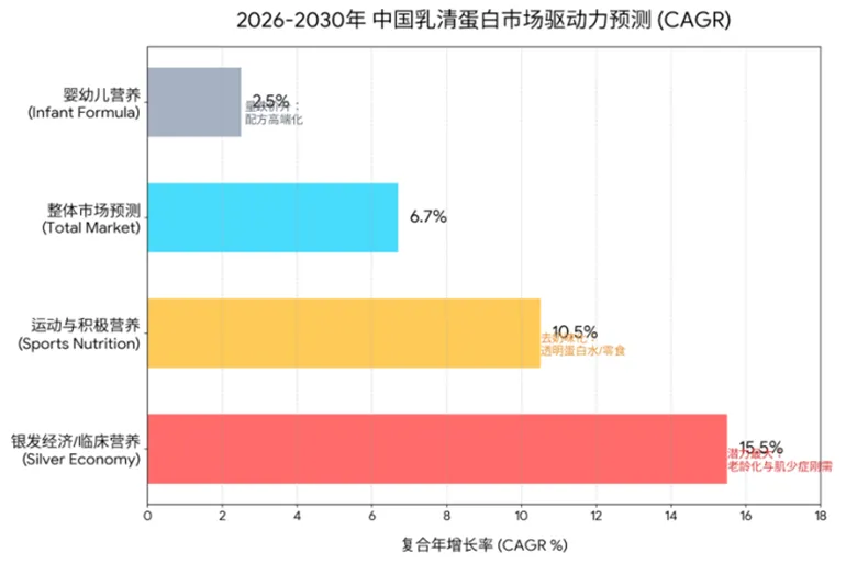 市场分层加剧(K型分化):市场正在撕裂为两个截然不同的世界。低端市场(饲料、普通食品填充)受制于生猪养殖周期和植物蛋白的低价替代,陷入成本红海,价格敏感度极高,且极易受贸易战关税影响。而高端市场(临床营养、超高端婴配、GLP-1伴侣)则因老龄化加剧、新国标实施及减重药物普及,展现出极强的刚性需求和抗周期能力。乳清蛋白不再是大宗商品,而是被拆解为α-乳白蛋白、乳铁蛋白、WPI等高功能性模块,按毫克计价。