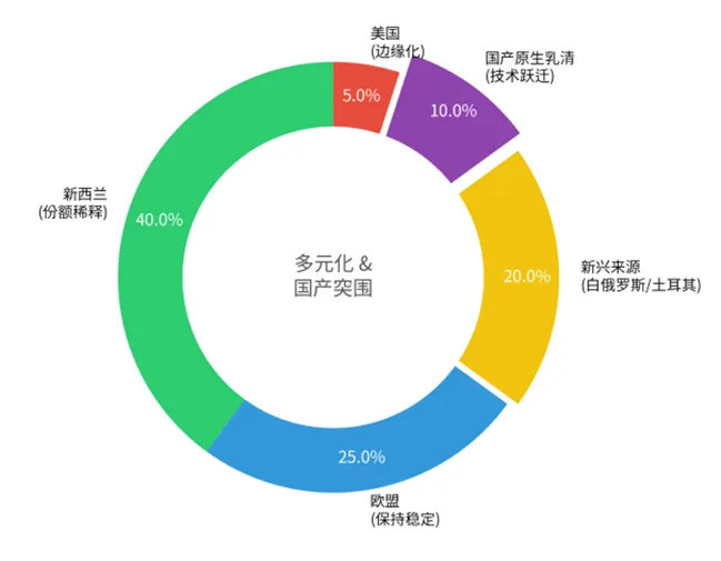 地缘政治与贸易武器化:乳清蛋白已成为大国博弈的筹码。中国对欧盟乳制品的反补贴调查及42.7%的关税,叠加中美贸易的长期摩擦,使得全球供应链极度脆弱。高度依赖单一来源(如目前过度依赖新西兰)的企业将面临巨大的断供或成本失控风险。供应链的多元化(如拓展白俄罗斯、阿根廷来源)迫在眉睫。