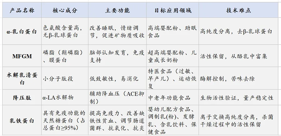 随着分离技术的进步,行业已能从乳清中提取微量但具有极高生物活性的特定蛋白,如α-乳白蛋白(α-Lactalbumin)、乳铁蛋白(Lactoferrin)、乳脂球膜(MFGM) 等。
